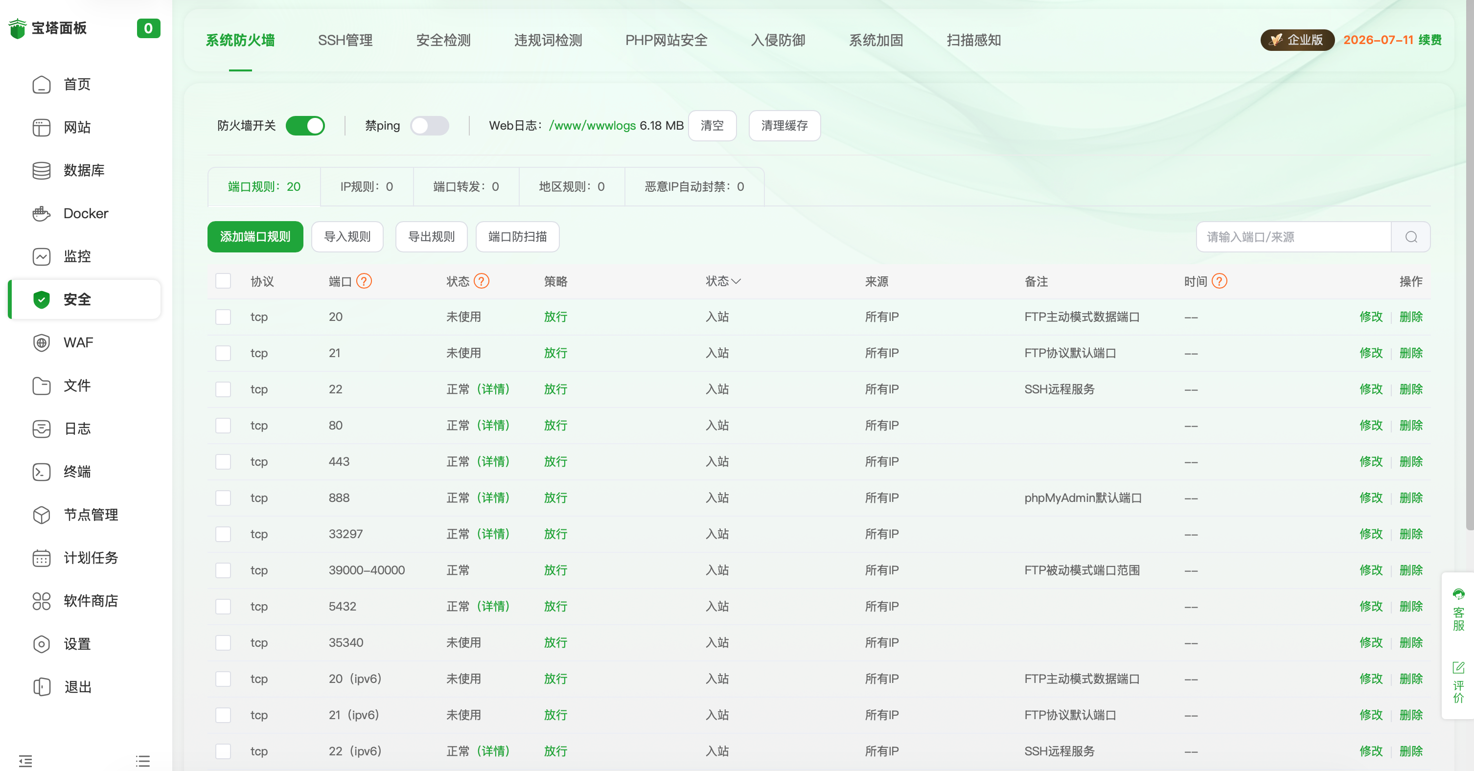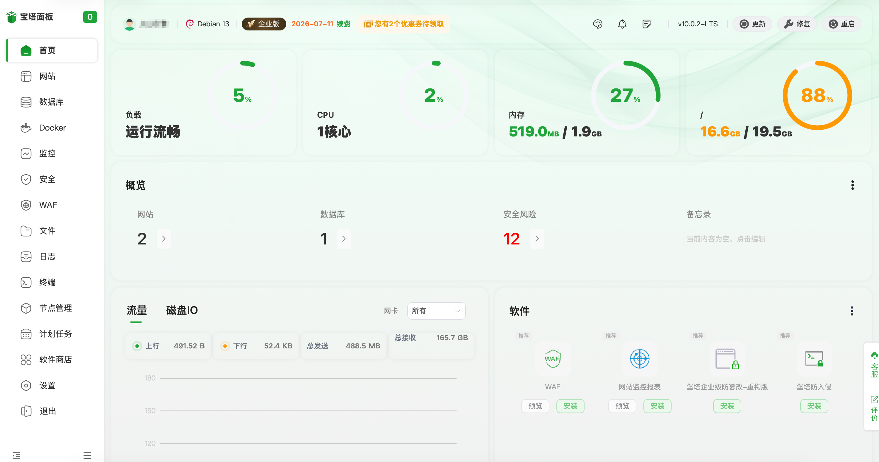 宝塔面板集成了一键部署LAMP/LNMP/Tomcat/Node.js环境,通过web端可视化操作,优化了建站流程,提供安全管理、计划任务、文件管理以及软件管理等功能。官方专业运维技术提供服务。